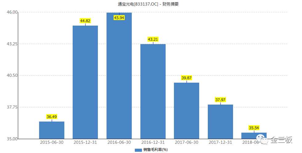 此外,通寶光電2015年以來(lái)銷售毛利率也在持續(xù)下滑,2018年中報(bào)的35.54%,更是比去年同期下滑了4.33個(gè)百分點(diǎn),公司的市場(chǎng)競(jìng)爭(zhēng)能力或已顯著下滑。