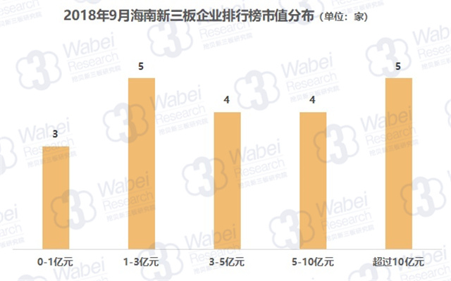 截止到2018年9月30日,新三板共有10946家掛牌公司,海南有39家新三板企業(yè),占比0.4%;其中21家企業(yè)有市值,占比53.8%。