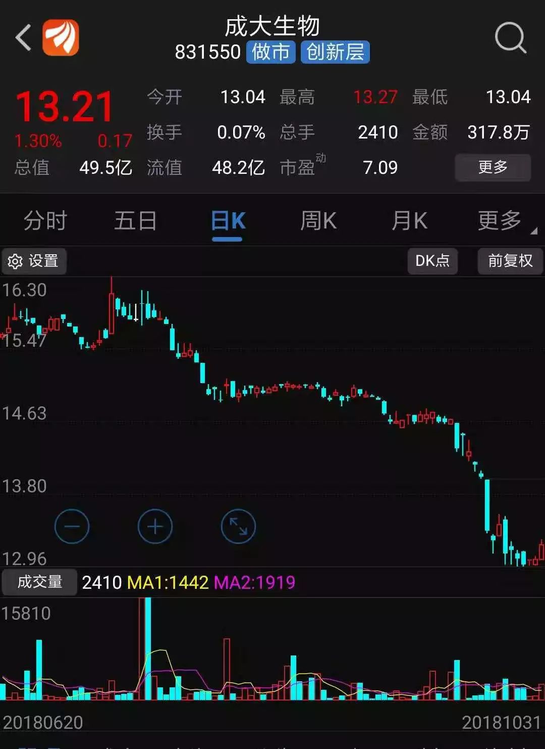 不過此后成大生物就開始不斷下跌。10月31日,其股價上漲1.3%,收于13.21元/股,較5月7日跌去24%。