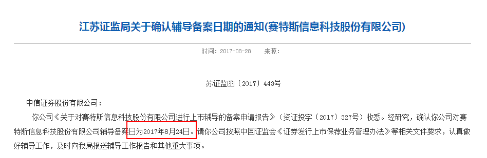 江蘇證監(jiān)局網(wǎng)站信息顯示,2013年3月29日,賽特斯就首次進行了上市輔導(dǎo)備案,開始接受平安證券的上市輔導(dǎo)。2017年8月24日,賽特斯再度開始上市輔導(dǎo),輔導(dǎo)券商為中信證券。