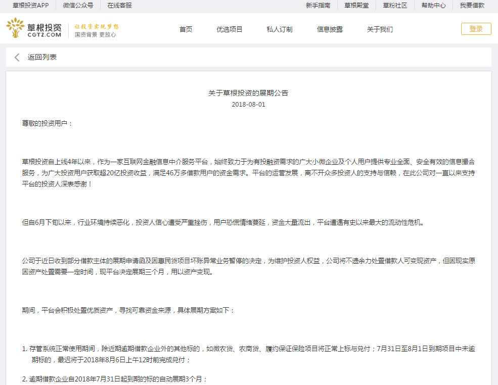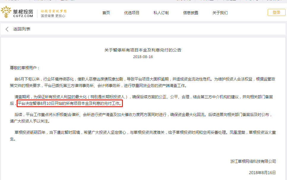 8月16日,草根投資發(fā)布關(guān)于平臺(tái)實(shí)施 “涅槃?dòng)?jì)劃”及近期工作的匯報(bào),與此同一天,草根投資決定暫停8月10日開始的所有項(xiàng)目本金及兌付工作。