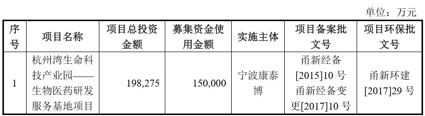 募投項目只有一個,杭州灣生命科技產(chǎn)業(yè)園的生物醫(yī)藥研發(fā)服務(wù)基地項目,總投資額19.83億元,擬使用募資金額15億元。
