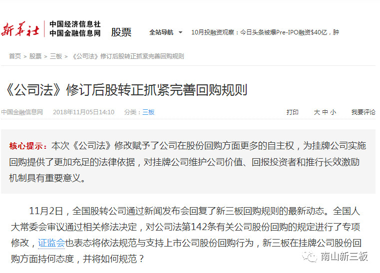 10月26日,全國人大常委會正式審議通過相關修改決定,對公司法第142條有關公司股份回購的規(guī)定進行了專項修改。新增回購情形、簡化決策程序、建立庫存股制度,讓公司回購自由度大幅提升。筆者認為在當前,股份回購在新三板掛牌企業(yè)中有著很強的市場需求,相關制度的優(yōu)化和落地也具有較強的急迫性。