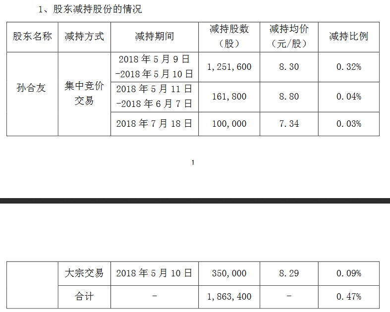 根據(jù)積成電子此前公告,今年5月9日至2018年7月18日期間,孫合友合計(jì)減持公司無(wú)限售條件流通股186.34萬(wàn)股,占公司總股本的0.47%;截至7月20日,孫合友先生持有公司無(wú)限售條件流通股575.14萬(wàn)股,占公司總股本的1.46%。