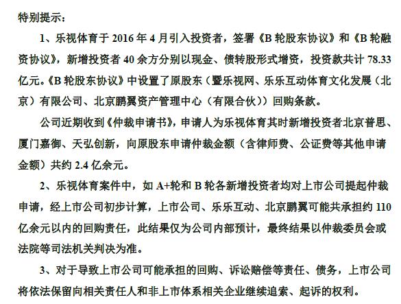 據(jù)樂視網(wǎng)評估,樂視體育案件中,如A+輪和B輪各新增投資者均對上市公司提起仲裁申請,樂視網(wǎng)、樂樂互動、北京鵬翼可能共承擔(dān)約110億余元以內(nèi)的回購責(zé)任。