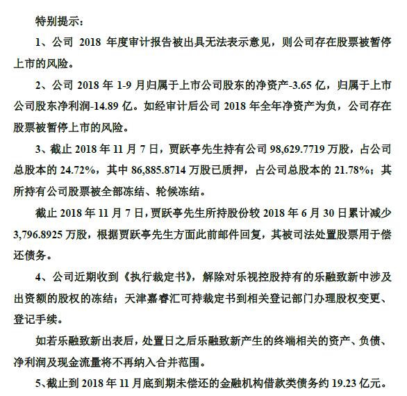 2018 年11 月7 日,賈躍亭先生持有公司98,629.7719 萬股,占公司總股本的24.72%,其中86,885.8714 萬股已質(zhì)押,占公司總股本的21.78%;其所持有公司股票被全部凍結(jié)、輪候凍結(jié)。