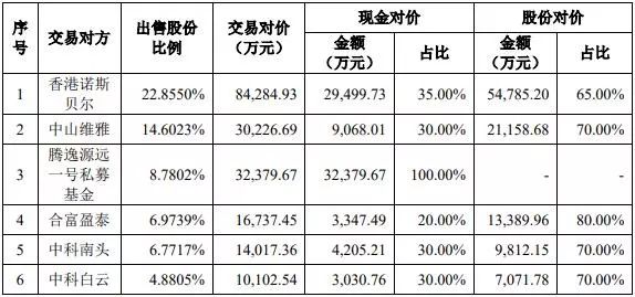 根據(jù)各交易對(duì)方的出售股份比例、交易對(duì)價(jià)、對(duì)價(jià)支付方式,第一大股東將套現(xiàn)2.95億元,而騰逸源遠(yuǎn)一號(hào)私募基金將全額套現(xiàn)3.24億元。