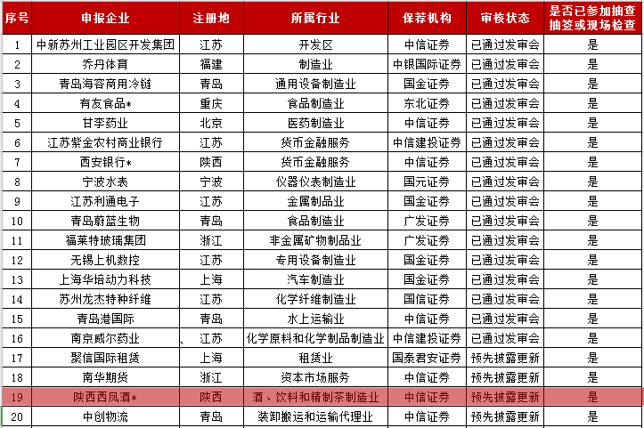 本周上交所上交所無新申報(bào)IPO企業(yè),中止恢復(fù)兩家:陜西西鳳酒和青島百洋醫(yī)藥(新增企業(yè)以藍(lán)色列示,中止恢復(fù)企業(yè)以淺紅色列出,下同)。