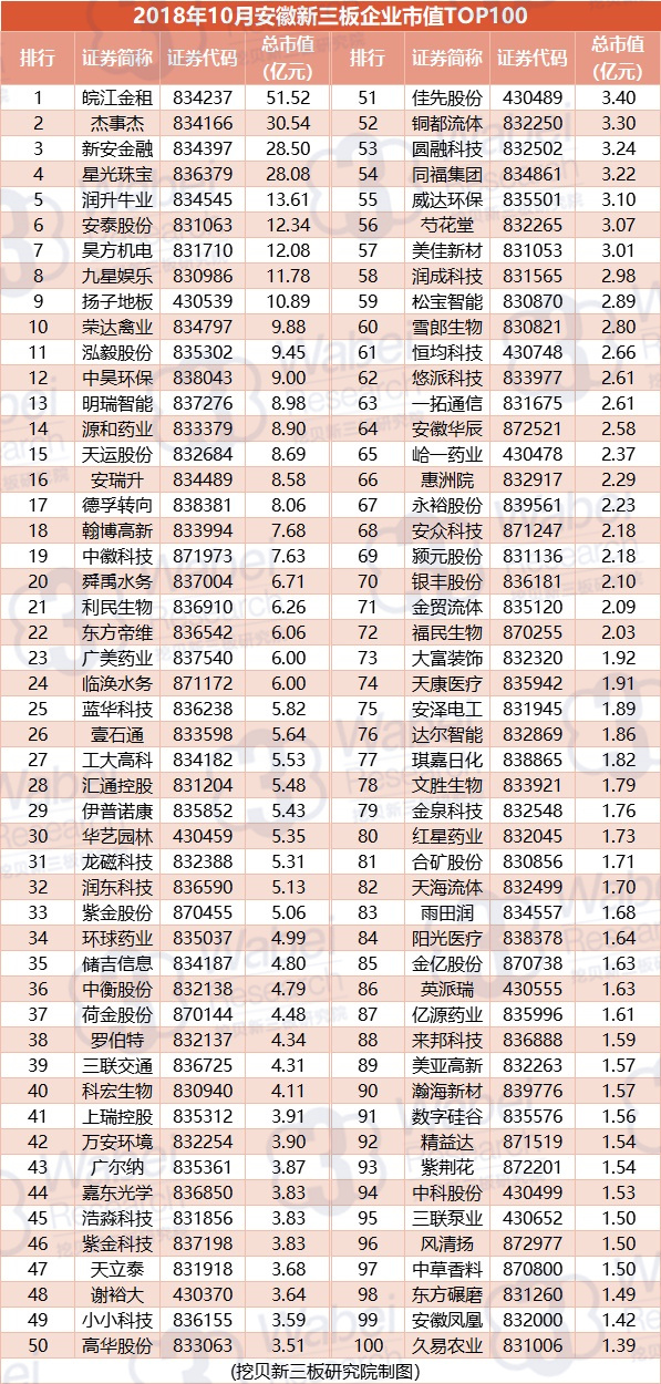 附:2018年10月安徽新三板企業(yè)市值TOP100