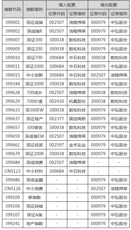 挖貝網(wǎng)訊11月14日中午,深交所發(fā)布《關(guān)于調(diào)整深證成指等指數(shù)樣本股的公告》,中弘股份(000979)由于即將終止上市被踢出,涪陵榨菜被調(diào)入。