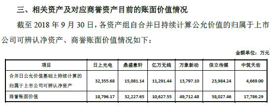 2015年5月完成對日上光電100%股權(quán)的收購,使其成為公司全資子公司。該次交易合并成本金額為3.9億元,合并日歸屬于上市公司可辨認(rèn)凈資產(chǎn)公允價(jià)值為2.02億元,確認(rèn)商譽(yù)1.88億元。截至2018年9月30日,日上光電含商譽(yù)的在合并日公允價(jià)值基礎(chǔ)上持續(xù)計(jì)算的歸屬于上市公司可辨認(rèn)凈資產(chǎn)賬面價(jià)值5.12億元。